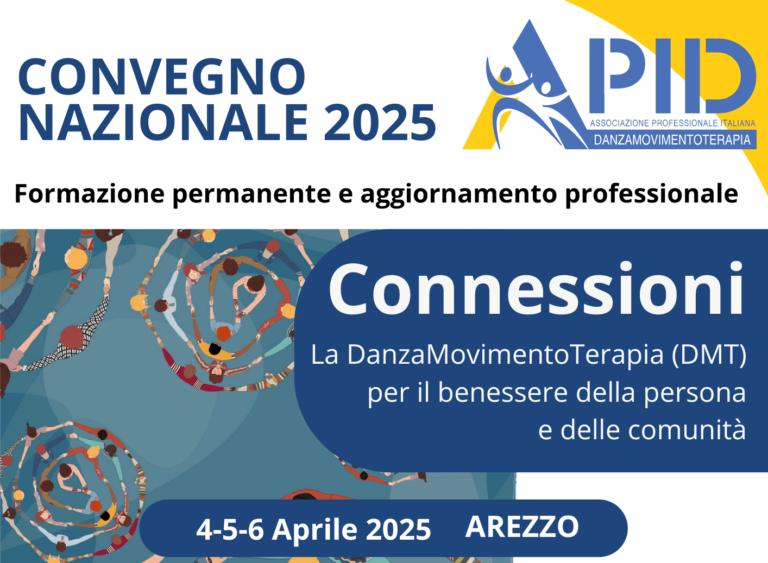Il 4, 5 e 6 aprile 2025 si svolgerà ad Arezzo il Convegno Nazionale e Formazione permanente di APID® dal titolo CONNESSIONI. DanzaMovimentoTerapia per il BENESSERE della PERSONA e delle COMUNITA’.