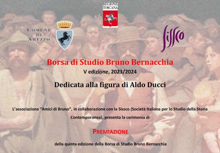 La borsa di studio è promossa dall’associazione “Amici di Bruno” in collaborazione con la Società Italiana per lo Studio della Storia Contemporanea (Sissco), sotto il patrocinio della Regione Toscana e del Comune di Arezzo. Questo premio non solo celebra il lavoro di ricerca storica, ma onora anche la memoria di Bruno Bernacchia sostenendo i giovani storici italiani. E, da questa edizione, viene dedicata ad una figura di spicco della politica e della vita civile di Arezzo: la prima dedica è ad Aldo Ducci.