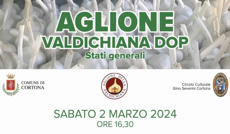 Titolo dell’incontro è «Aglione Dop», l’organizzazione e del Circolo culturale Gino Severini di Cortona unitamente all’associazione Produttori e trasformatori Aglione della Valdichiana con il patrocinio del Comune di Cortona.