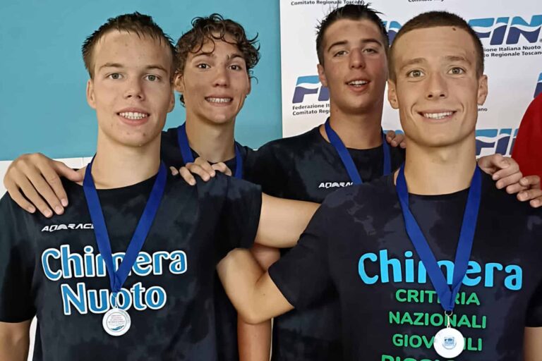 Due positivi risultati sono arrivati anche nelle staffette 4×100 stile libero femminile con l’ottavo posto di Burzi, Donati, Mazzeschi E. e Mazzeschi N., e 4×100 misti maschile con Bartolini, Ferrari, Gambini e Mealli. La squadra della Chimera Nuoto è stata infine completata da Vittoria Ermini, Anna Viola Falchi, Gaia Formelli, Tommaso Gepponi, Alessio Menchetti, Leonardo Rossi e Maria Sole Sacchetti tra i Ragazzi, e da Giulio Bracciali, Viola Calvo Pegna, Samuele Magnani, Lorenzo Menchetti e Francesco Sassoli tra gli Juniores.