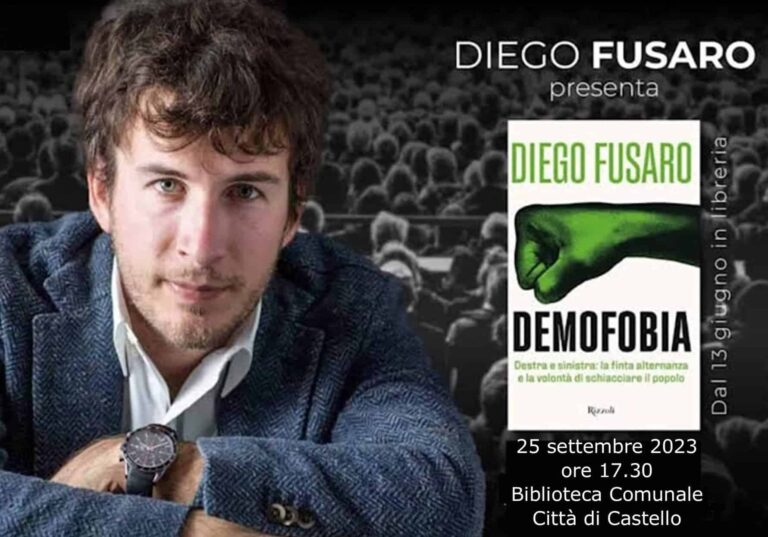 Lunedì 25 settembre 2023 alle ore 17.30 il filosofo, scrittore e saggista Diego Fusaro sarà ospite dell’Associazione Articolo 49 per la presentazione del libro Demofobia edito da Rizzoli presso la Biblioteca Comunale di Città di Castello.