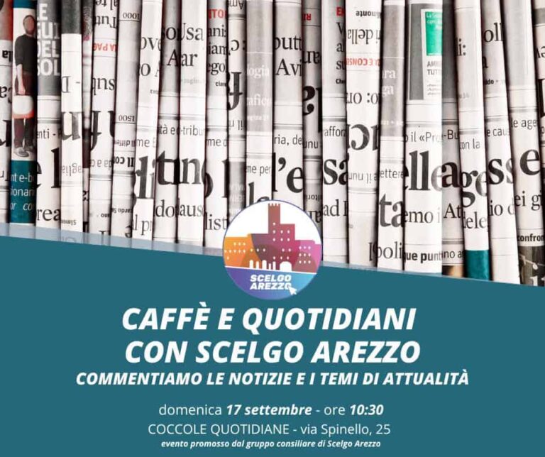Nuova iniziativa del gruppo consiliare Scelgo Arezzo: appuntamento domenica 17 settembre alle 10,30 con “Caffè e quotidiani”, una rassegna stampa che permetterà di confrontarsi e commentare le notizie e i temi di più stringente attualità. Via Spinello 25, sotto la galleria che immette in via Verdi.
