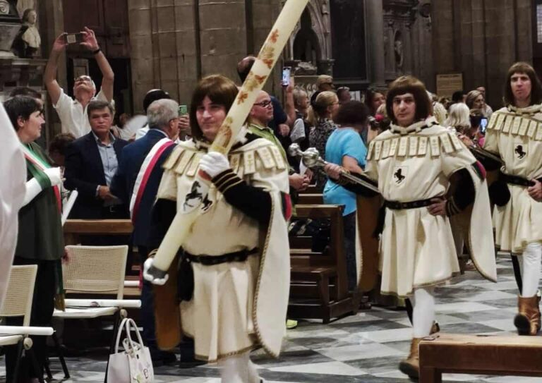 Così la sera del 6 agosto Arezzo celebra il suo Santo Protettore con l’Offerta del Cero votivo così come contenuto nello Statuto del 1327 “Ad onore e reverenza del Beato Donato martire, presule e patrono della Città di Arezzo nel giorno della sua festività devono essere offerti ceri dal Comune di Arezzo. Parimenti tutti e i singoli castelli e villaggi del contado e del distretto di Arezzo”.