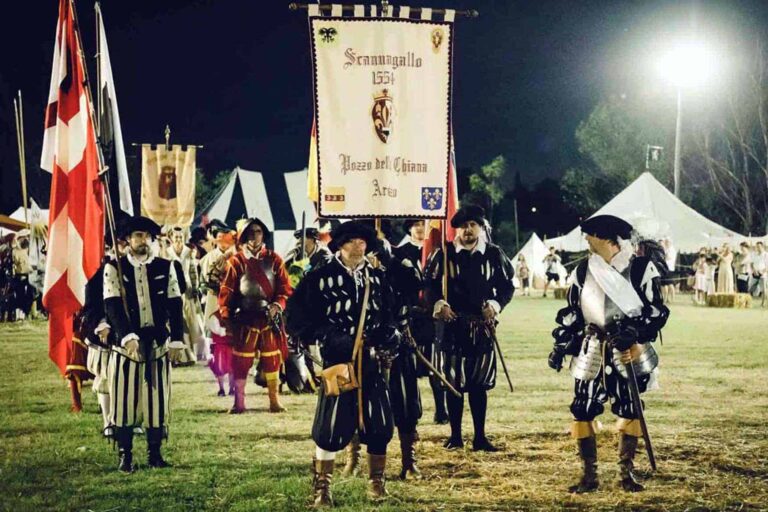 La serata verrà invece scandita, dalle 21.00, dallo spettacolo degli sbandieratori di Monte San Savino, dalle danze rinascimentali, dalle esibizioni del giullare Messer Lurinetto e dall’assalto al campo a cura delle compagnie militari.