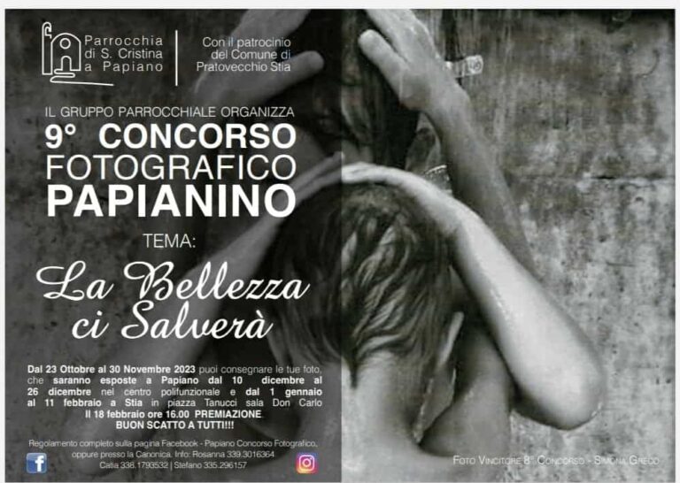 Eccoci alla 9° edizione del Concorso Fotografico Papianino dal titolo “ LA BELLEZZA CI SALVERÀ”. Dal 23 ottobre al 30 novembre 2023 i partecipanti possono consegnare le buste con le foto come meglio indicato nel regolamento pubblicato sui facebook ( Papiano Concorso Fotografico) e instagram ( papiano.concorso.fotografico). Dal 10 dicembre ( giorno dell’inaugurazione!) al 26 dicembre 2023 le foto saranno esposte a Papiano – Pratovecchio Stia (AR) – Centro Polifunzionale – per essere poi trasferite dal 1° gennaio all’11febbraio 2024 in piazza Tanucci a Stia – sala “Don Carlo – con premiazione dei vincitori il 18 febbraio 2024.