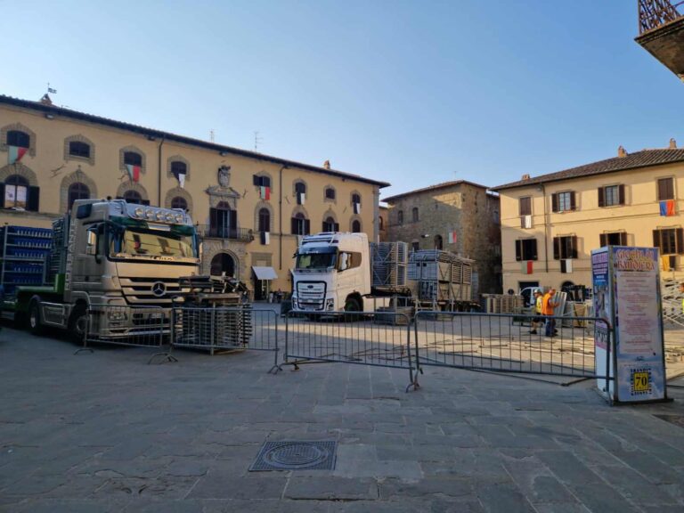 Si avvicinano le feste del Palio e giร in piazza Torre di Berta fervono i preparativi per lโallestimento delle tribune che ospiteranno il numeroso pubblico che assisterร ai diversi appuntamenti in calendario.