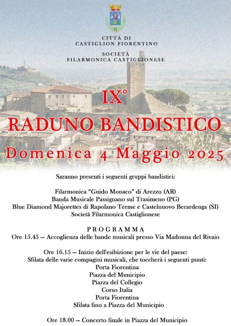 A esibirsi la Filarmonia “Guido Monaco” di Arezzo, la banda Musicale Passignano sul Trasimeno, la “Blue Diamond Majorettes di Rapolano Terme e Castelnuovo Berardenga e la “Società Filarmonica Castiglionese”.