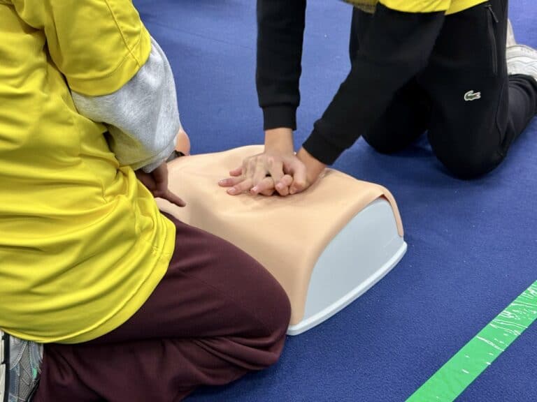 gli studenti, a coppie, si sono alternati nell’esecuzione delle compressioni toraciche su manichini collegati al dispositivo Challenge del 118, programmato per valutare frequenza e profondità delle compressioni.