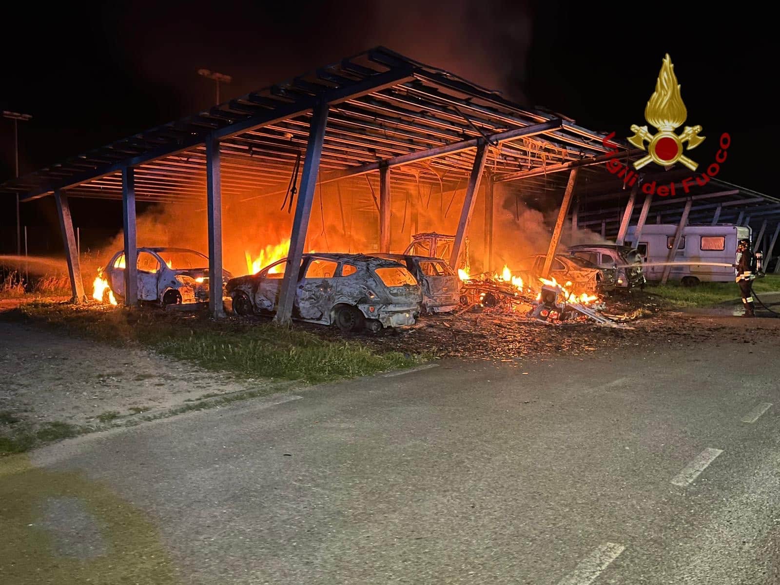 Ad andare a fuoco sono stati 8 auto e un camper sotto una tettoia in acciaio con copertura di pannelli fotovoltaici.
