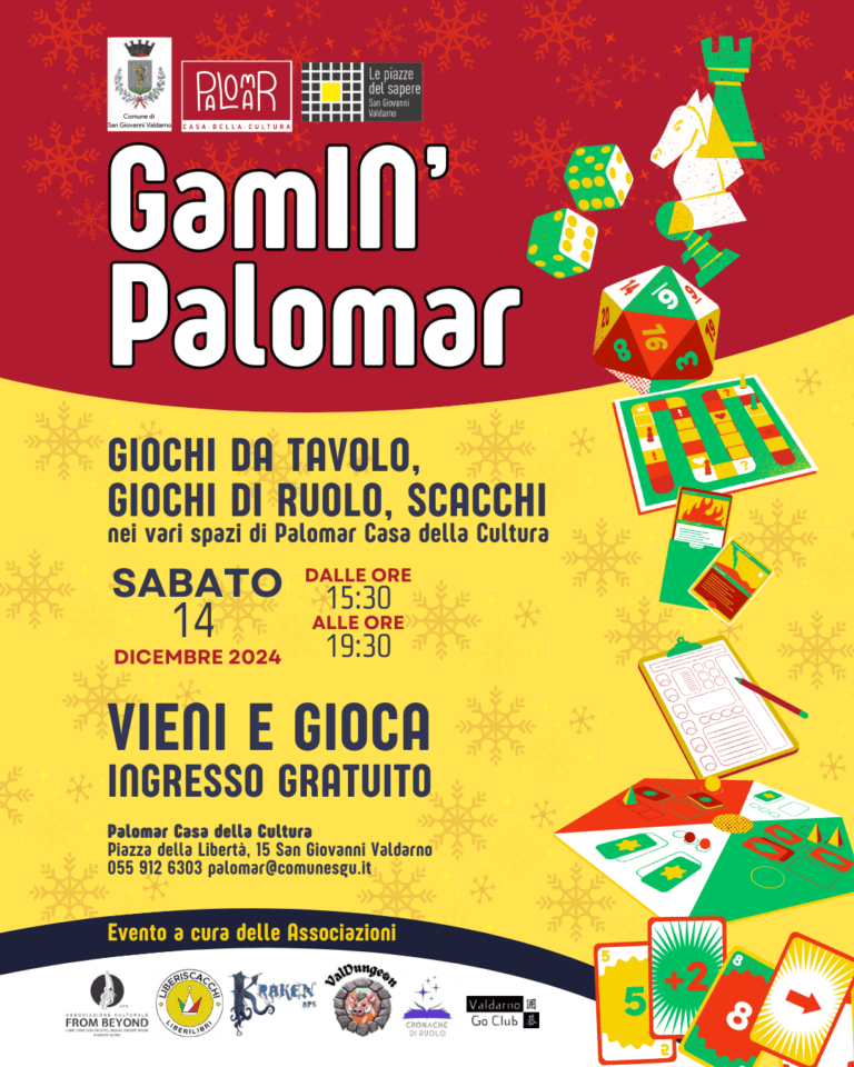 Dadi, carte e strategia per la manifestazione dedicata al gioco analogico e intelligente organizzata dal Comune di San Giovanni Valdarno in collaborazione con le diverse associazioni ludiche della zona: From Beyond Larp, LiberiLibri&LiberiScacchi, Kraken Gdr, ValDungeon, Cronache di Ruolo, Valdarno Go Club.