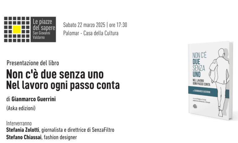 Sabato 22 marzo, alle 17,30, a Palomar – Casa della Cultura, si terrà la presentazione del libro Non c’è due senza uno. Nel lavoro ogni passo conta di Gianmarco Guerrini (Aska Edizioni).