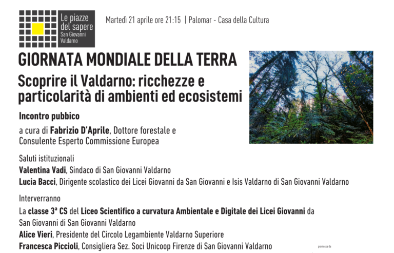 Prosegue il calendario di aprile de “Le Piazze del Sapere”, la rassegna promossa dal Comune di San Giovanni Valdarno in collaborazione con il Centro per il libro e la lettura e Unicoop Firenze – sezione soci Coop di San Giovanni Valdarno. Martedì 21 aprile alle 21,15, nella sala David Sassoli di Palomar Casa della Cultura, si terrà un’iniziativa dedicata alla Giornata Mondiale della Terra, celebrata ogni anno il 22 aprile.