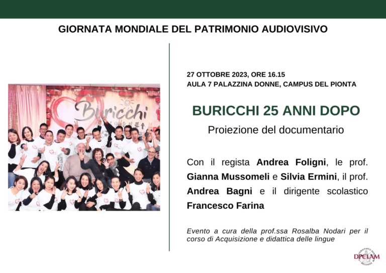 In occasione della Giornata mondiale per il patrimonio audiovisivo, istituita dall’UNESCO come occasione per promuovere la consapevolezza dell’importanza di immagini e suoni per la memoria collettiva, il corso di laurea in Lingue per la Comunicazione Interculturale e d’Impresa dell’Università di Siena organizza la proiezione del documentario “Buricchi: 25 anni dopo”.