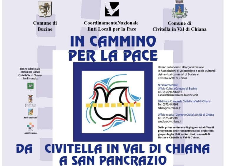 Lโ€™iniziativa, in ricordo delle 244 vittime civili dellโ€™Eccidio nazifascista del 29 giugno 1944, che si svolge lungo la strada che collega i luoghi della strage dei due territori comunali – in un percorso di circa 9 chilometri che da Civitella condurrร  fino a San pancrazio, quello stesso tracciato in cui le truppe della divisione Herman Gรถring sparsero sangue di uomini, donne e bambini innocenti – รจ organizzata dalle Amministrazioni comunali di Bucine e Civitella in Val di Chiana, Coordinamento nazionale Enti Locali per la Pace, con lโ€™adesione di Regione Toscana, Provincia di Arezzo, Anci Nazionale e Anci Toscana, nellโ€™ambito delle celebrazioni programmate nellโ€™81esimo anniversario dellโ€™Eccidio di Civitella, Cornia e San Pancrazio e nel 80esimo anniversario della Liberazione.