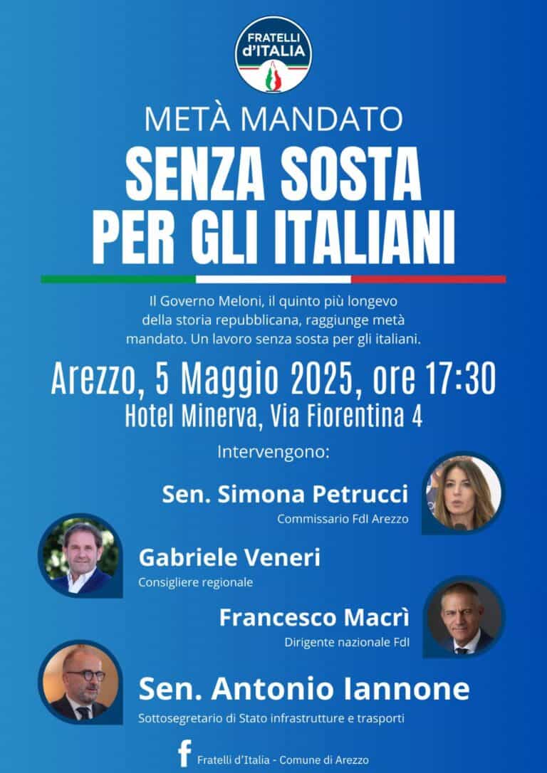 Il governo Meloni raggiunge metà mandato, diventando il quinto più longevo della storia repubblicana. Fratelli d’Italia organizza ad Arezzo un’iniziativa per presentare i risultati raggiunti: il 5 maggio a partire dalle 17:30, presso l’Hotel Minerva di via Fiorentina 4, si terrà un incontro aperto al pubblico e alla stampa con protagonisti il senatore Antonio Iannone, Sottosegretario di Stato alle infrastrutture e trasporti, il commissario provinciale Fdi, senatrice Simone Petrucci, il consigliere regionale Gabriele Veneri, il dirigente nazionale del partito Francesco Macrì.