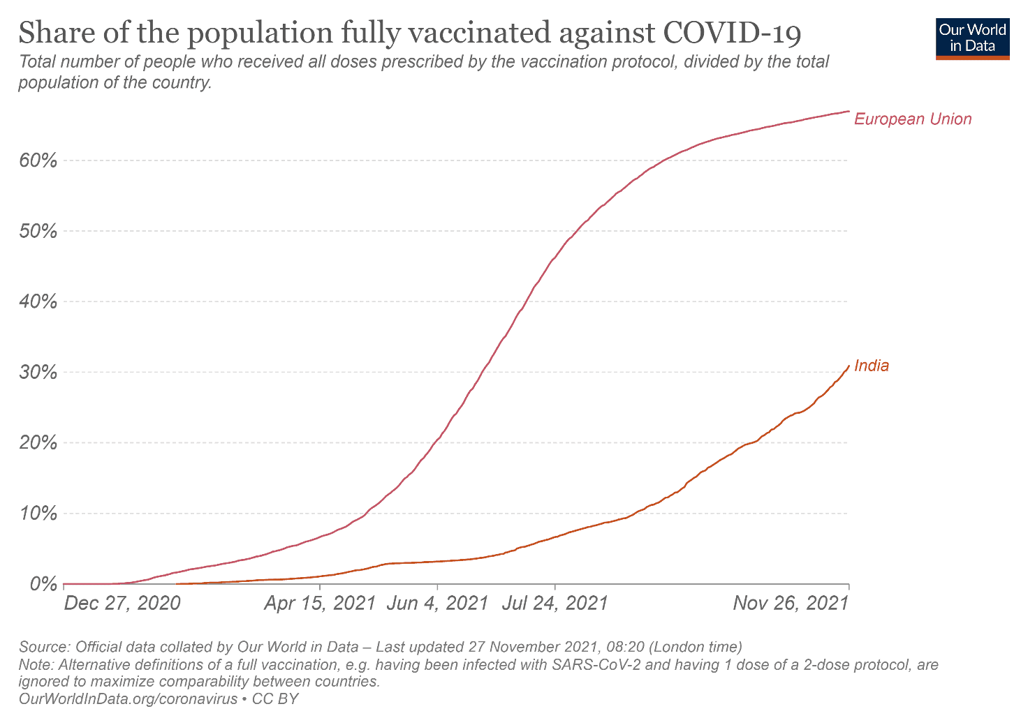 Il tasso media di vaccinazione della popolazione supera il 65% in Europa mentre si ferma al 30% in India.