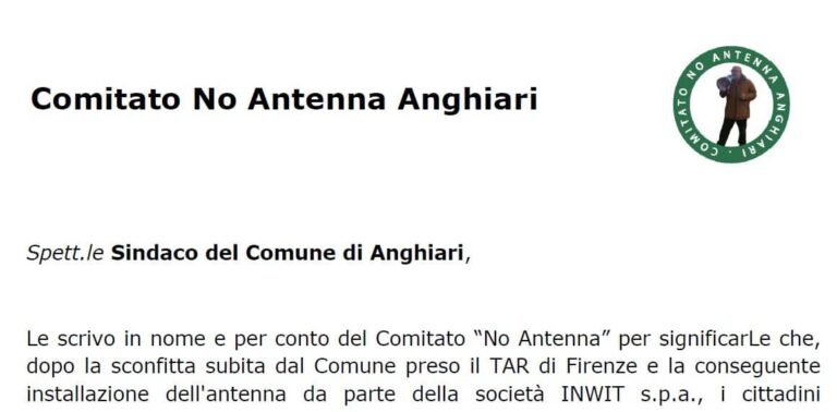 Le scrivo in nome e per conto del Comitato โNo Antennaโ per significarLe che, dopo la sconfitta subita dal Comune preso il TAR di Firenze e la conseguente installazione dell’antenna da parte della societร INWIT s.p.a., i cittadini aderenti al nostro Comitato non si sono minimamente scoraggiati, ma anzi abbiamo accolto e stiamo accogliendo nuove adesioni.