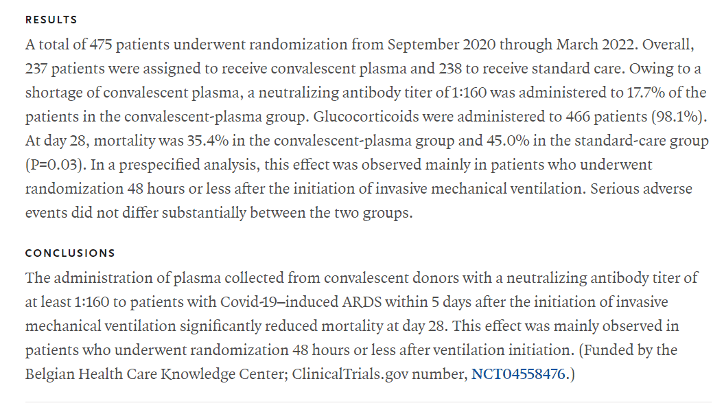 Uno studio pubblicato il 26 ottobre 2023 su The New England Journal of Medicine dal titolo “Convalescent Plasma for Covid-19–Induced ARDS in Mechanically Ventilated Patients” lo conferma.
