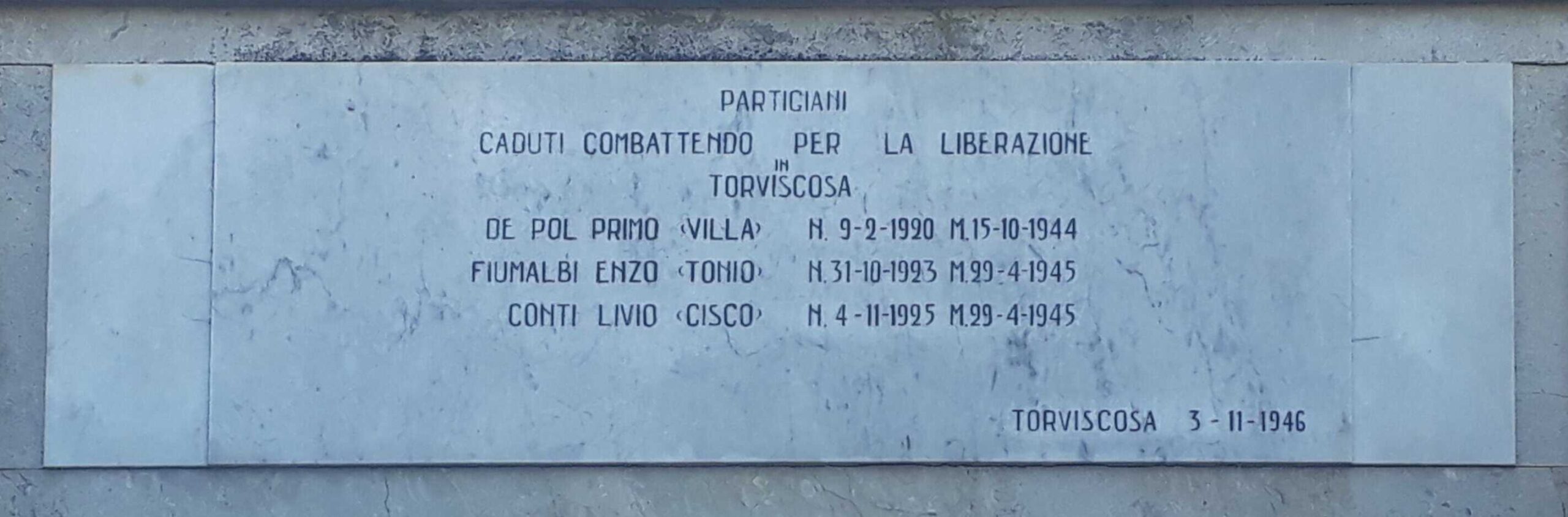 Anche a Torviscosa nel novembre 1946 è stata posta una lapide che ricorda Livio Conti assieme ai suoi compagni come lui caduti per la nostra Libertà.