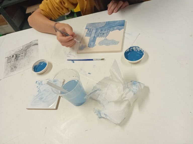 Il laboratorio di decorazione ceramica ha prodotto piastrelle decorate con la tecnica sottocristallina con utilizzo di colori adatti alla cottura della ceramica.
