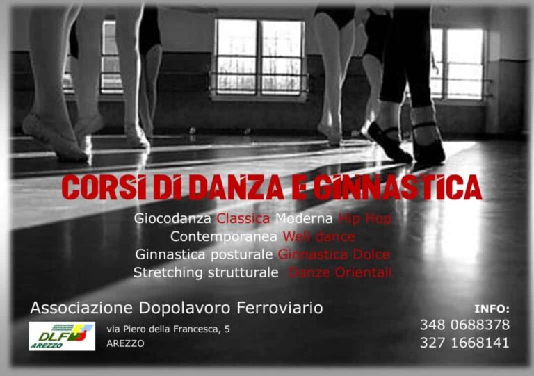 Da lunedì 25 settembre 2023 alle ore 17.00 il Dopolavoro Ferroviario torna a proporre – dopo un primo anno conclusosi con un bellissimo spettacolo al Teatro Pietro Aretino – corsi di danza e ginnastica nella sede in via Piero della Francesca, 3 in Arezzo.