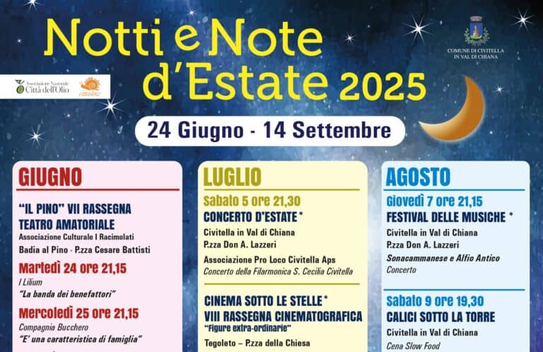 Il Comune di Civitella in Val di Chiana presenta la rassegna culturale estiva Notti e Note d’Estate 2025, che da giugno a settembre promette di animare l’estate dei cittadini e dei turisti con proposte culturali di alto profilo e spessore.