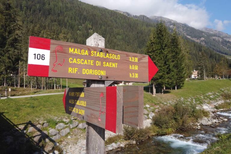 Dopo la malga Stablasolo troviamo il bivio per le Cascate di Saènt.