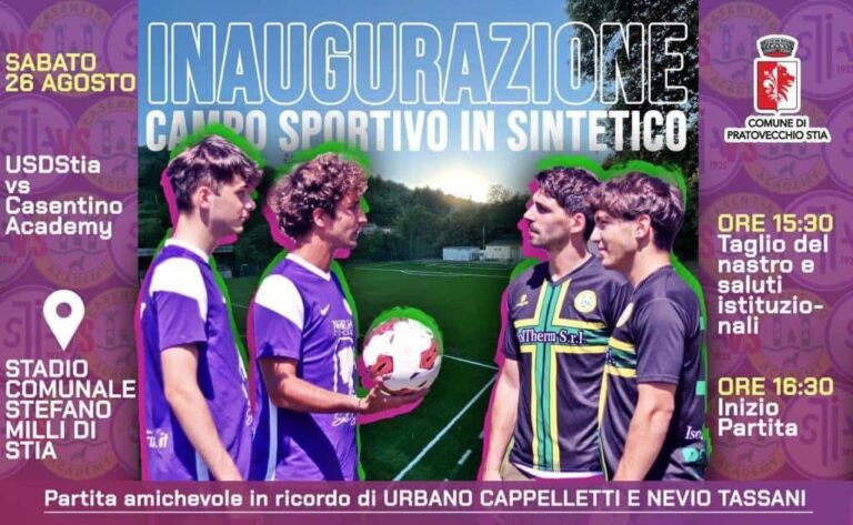 Il sindaco di Pratovecchio Stia Nicolò Caleri ha annunciato così l’inaugurazione del campo sportivo di Stia recentemente ristrutturato grazie ad un finanziamento del CONI attraverso il progetto “Sport e periferie” con la compartecipazione economica del comune. Oggi alle 15,30 è in programma il taglio del nastro seguito da un’amichevole tra l’USD Stia e la Casentino Academy.