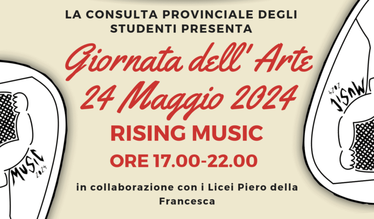 Abbiamo poi Rising Music: organizzato per il 24 aprile, dalle 17:00 alle 22:00, con la collaborazione del Liceo Piero della Francesca, consisterà in un contest in cui i giovani potranno esibirsi, cantando e suonando in autonomia, previa selezione da parte di una commissione di artisti.