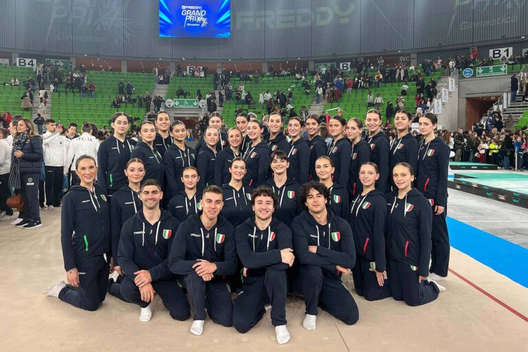 Ventinove atleti e atlete di diverse età, guidati dall’allenatrice Federica Peloso e capitanati da Alessia Peruzzi, hanno dunque regalato emozioni ai quattromila spettatori presenti all’evento, mettendo in scena un esercizio dedicato all’arte e alla cultura italiane, con un omaggio alla meraviglia di alcune delle più importanti opere scultoree della storia.
