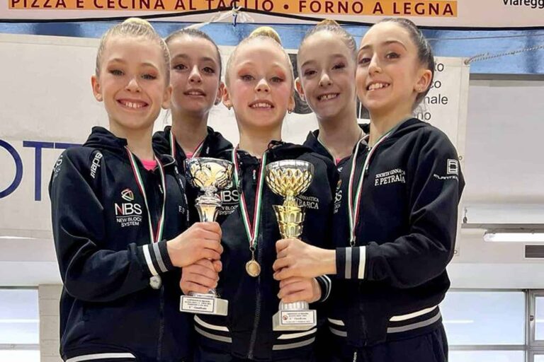 Caterina Falomi, Linda Fiorucci e Adele Tani, insieme a Viola Pasqui e Gaia Segoni, sono invece le ginnaste che hanno gareggiato nella categoria Allieve1 del Campionato di Squadra Allieve Gold e che hanno meritato il secondo posto di giornata che, unito al secondo posto ottenuto anche nella prima tappa, ha permesso di archiviare la manifestazione nella piazza d’onore alle spalle delle sole “padrone di casa” della Raffaello Motto di Viareggio.