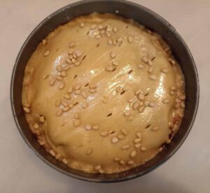 Bucherellare con la punta di un coltello la superficie, spennellare con il cucchiaio di chiare d’uovo tenuto da parte e terminare con i pinoli.