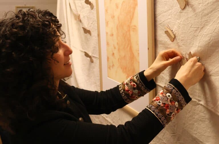 Ogni farfalla è munita di spilla retrostante e potrà essere attaccata insieme alle altre nel telo, accanto all’opera “Alveare”.