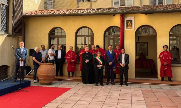 L’iniziativa prende avvio a seguito della deliberazione del Consiglio Provinciale dello scorso 26 giugno 2023, che ha approvato all’unanimità la mozione proposta dal Consigliere Simon Pietro Palazzo, che desidero ringraziare per avuto l’idea di valorizzare questa terrazza, che rappresenta uno dei punti più panoramici del centro storico della città di Arezzo. Desidero ringraziare inoltre Sua Ecccellenza Andrea Migliavacca per aver apprezzato subito l’iniziativa, inserendola all’interno del fitto programma delle celebrazioni. Attraverso la targa raffigurante il Santo, tra l’altro illuminata in notturna, rinsaldiamo un legame importantissimo tra gli enti locali e la Diocesi e soprattutto confermiamo l’affetto e la dedizione della cittadinanza aretina al suo Santo Patrono. La suggestiva terrazza è un collegamento ideale con la Cattedrale, per ridare valore all’individuo come persona, nella vita, nella famiglia, nel lavoro e nella fede, ma anche con la tradizione dei territori che compongono la Provincia di Arezzo. La terrazza San Donato del Palazzo della Provincia di Arezzo, è un ulteriore luogo a disposizione per eventi ed iniziative, assieme alla Sala dei Grandi, della Sala Fanfani, all’Atrio d’Onore e al Giardino Pensile, in questo caso sotto la protezione di San Donato.” Ad arricchire la giornata, l’artista Mauro Ghinassi ha inoltre donato un busto in terracotta raffigurante il Patrono, che è stato installato nel Foyer dell’ingresso alla terrazza, coniugando la classicità con la contemporaneità.