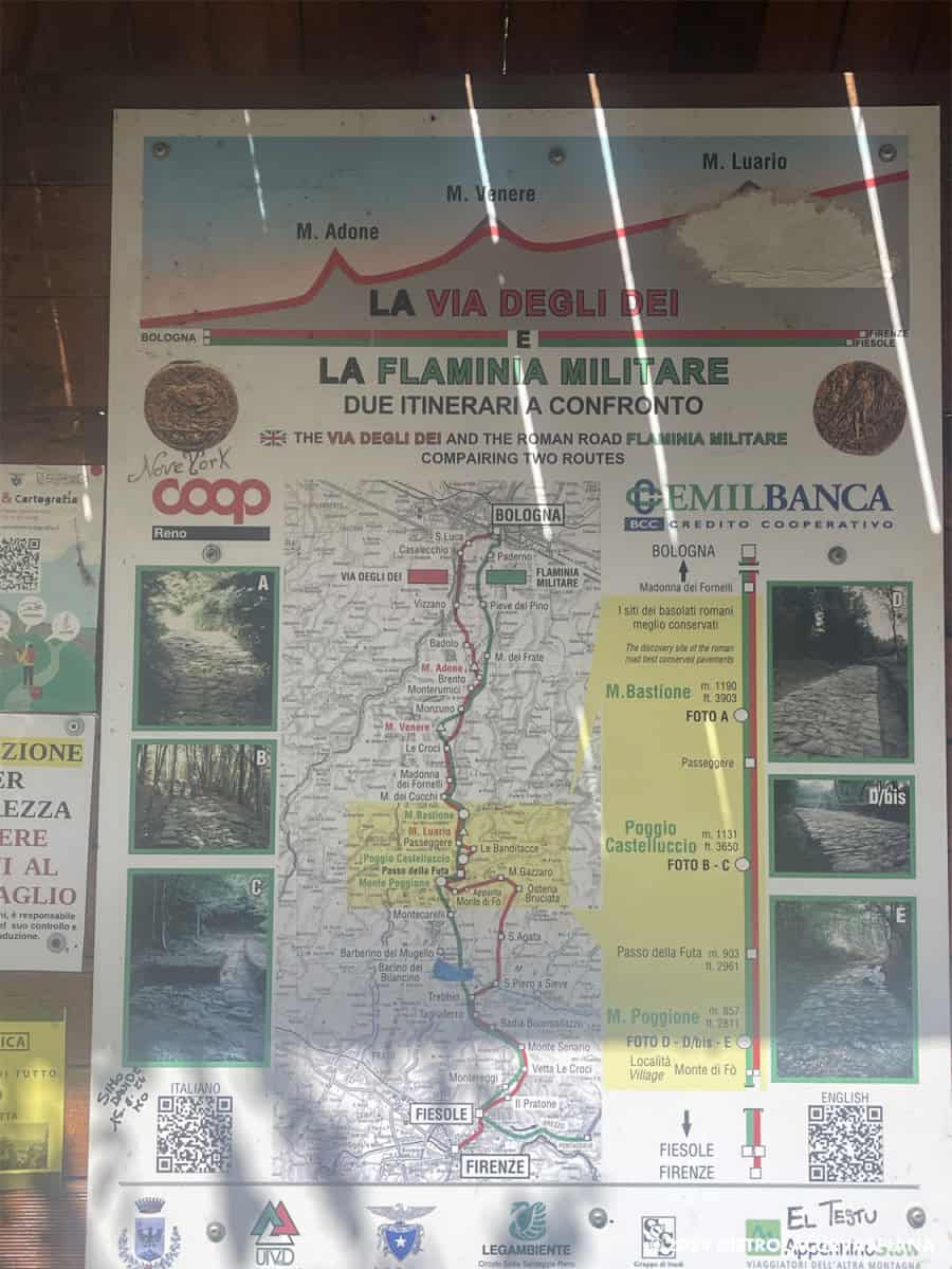 La tappa è caratterizzata da tratti impegnativi, come la salita al Monte del Frate e il passaggio per Brento, ai piedi del Monte Adone, dove la strada diventa asfaltata fino a Monzuno.