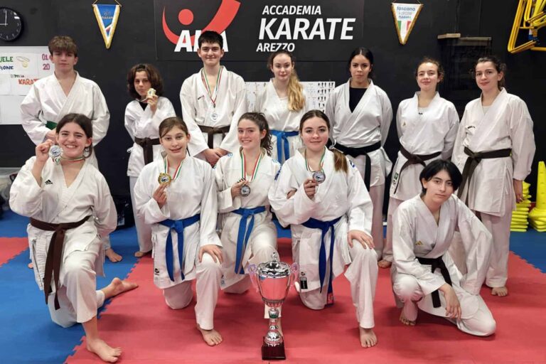 I titoli italiani dell’Accademia Karate Arezzo sono stati ben nove che, uniti ai tredici argenti e agli otto bronzi, hanno permesso di festeggiare uno storico terzo posto nella classifica generale della manifestazione tra sessantuno squadre complessive.
