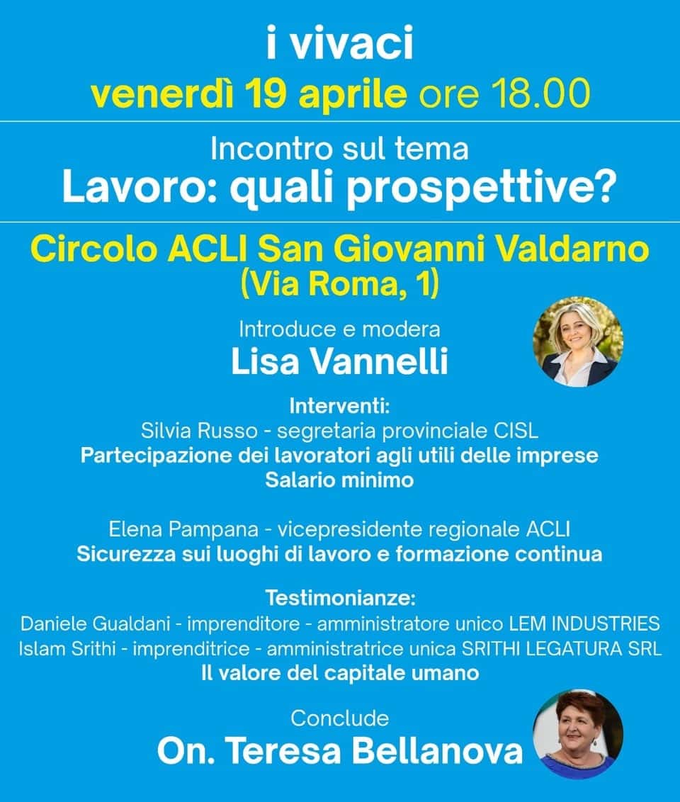 Venerdì 19 aprile alle ore 18 presso il Circolo ACLI di San Giovanni Valdarno, in via Roma 1, è in programma un incontro sul tema “Lavoro: quali prospettive?”.