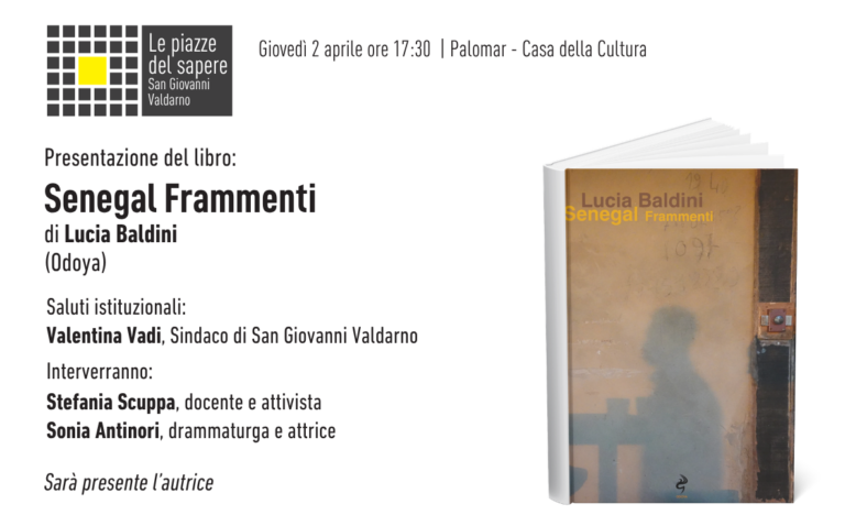 La protagonista del pomeriggio a Palomar – Casa della cultura sarà Lucia Baldini, fotografa e autrice del libro “Senegal Frammenti” (Odoya), che sarà presentato con la partecipazione dell’autrice e degli interventi di Stefania Scuppa, docente e attivista, e Sonia Antinori, drammaturga e attrice. I saluti istituzionali saranno affidati a Valentina Vadi, sindaco di San Giovanni Valdarno.