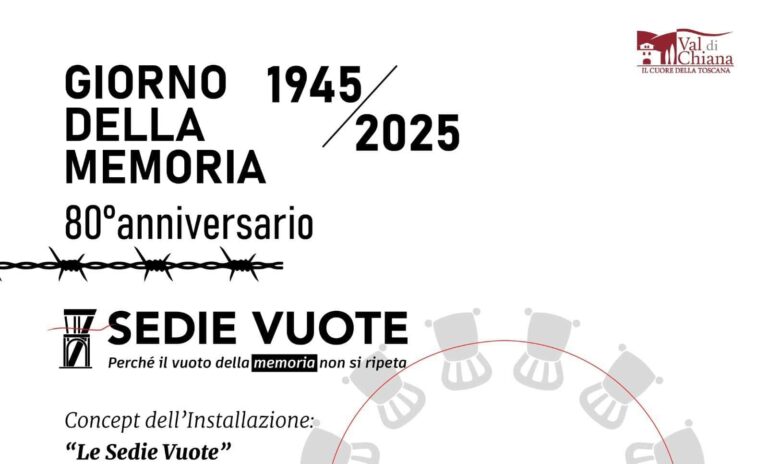 In occasione della Giornata della Memoria, a 80 anni dalla liberazione di Auschwitz, i 7 Comuni della Valdichiana Aretina uniscono le loro piazze in un gesto simbolico di riflessione e ricordo attraverso l’installazione artistica “Le Sedie Vuote” a cura di Stefano Cresti.