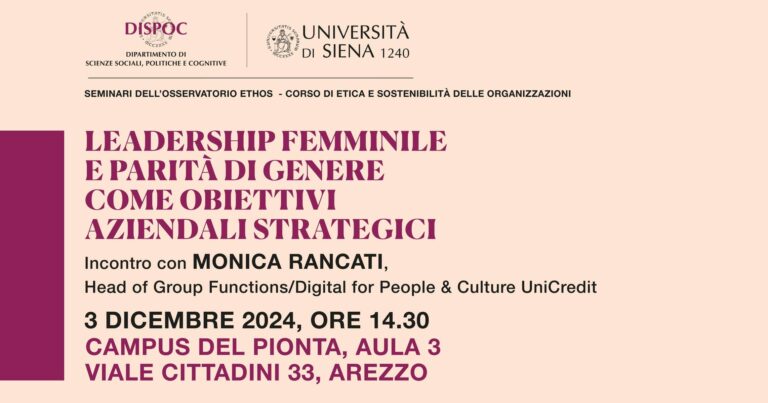 Il tema della leadership femminile sarà al centro dell’incontro organizzato dall’Osservatorio Ethos del Dipartimento di Scienze Sociali, Politiche e Cognitive (Dispoc) dell’Università di Siena, in programma martedì 3 dicembre alle ore 14,30, nell’aula 3 del Campus del Pionta dell’Università di Siena ad Arezzo (viale Cittadini,33) e aperto a tutti gli interessati.