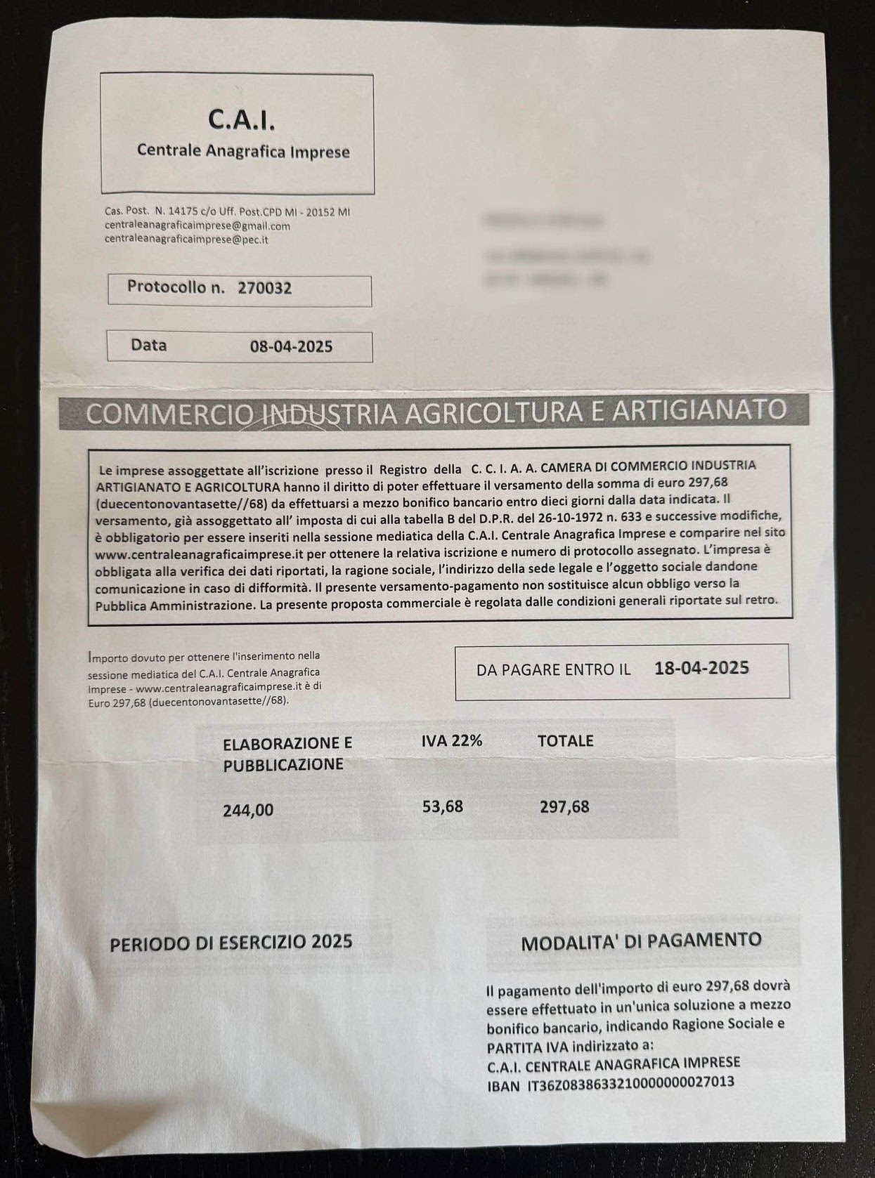 Sta circolando in questi giorni una lettera intestata “C.A.I. – Centrale Anagrafica Imprese”, che è arrivata anche al sottoscritto, con cui si richiede il pagamento di 297,68 euro per l’inserimento in un registro nazionale dedicato al commercio, agricoltura e artigianato. La comunicazione, che appare autorevole per grafica e linguaggio, può trarre in inganno ad lettura veloce molte imprese e professionisti, facendo pensare a un obbligo ufficiale legato all’iscrizione in Camera di Commercio.