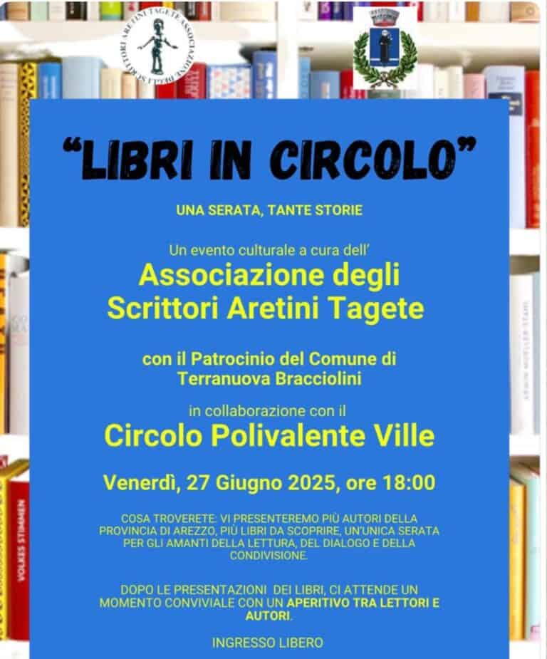 Si chiama Libri in Circolo ed è un evento culturale dedicato alla presentazione di opere di narrativa, saggistica e altri generi di scrittura non poetica. L’iniziativa, patrocinata dal Comune di Terranuova Bracciolini, si terrà venerdì 27 giugno alle ore 18 al Circolo polivalente delle Ville, ed è un progetto promosso dall’Associazione degli Scrittori Aretini Tagete.