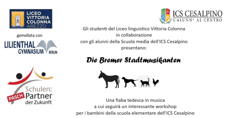 Come lo scorso anno, gli alunni del Liceo Linguistico Vittoria Colonna, in collaborazione con gli alunni della Scuola Media Cesalpino, presentano ai bambini della scuola elementare una fiaba tedesca in musica, a cui seguiranno degli interessanti Workshops di lingua tedesca.