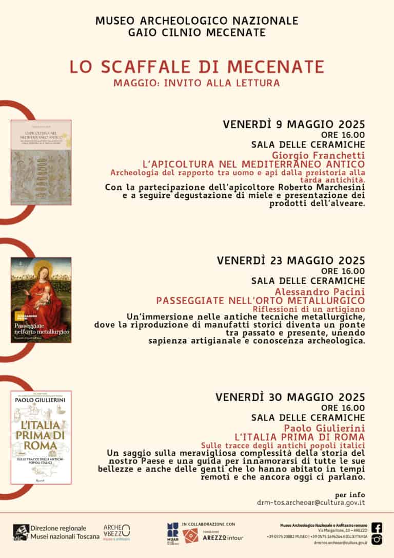 A inaugurare il ciclo venerdรฌ 9 maggio sarร Giorgio Franchetti con la sua ultima fatica letteraria โLโApicoltura nel Mediterraneo antico. Archeologia del rapporto tra uomo e api dalla preistoria alla tarda antichitร โ, che ripercorre il lunghissimo rapporto fra lโuomo e lโape nel bacino del Mediterraneo attraverso la rilettura di dati archeologi e fonti storiche.