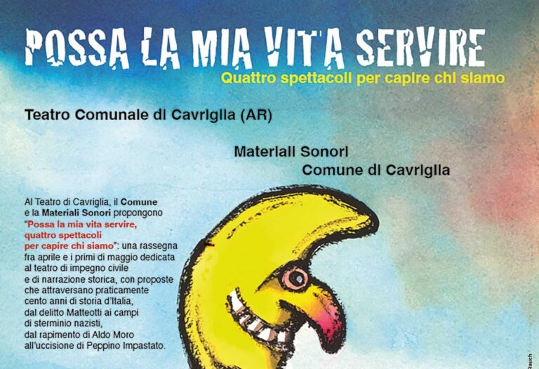 Dopo la stagione di Fondazione Toscana Spettacolo Onlus, si annuncia una nuova rassegna al Teatro Comunale di Cavriglia, che partirà a metà aprile e si concluderà i primi di maggio. Il Comune e la Materiali Sonori propongono “Possa la mia vita servire”, una serie di quattro spettacoli “per capire chi siamo”, dedicata al teatro di impegno civile e di narrazione storica, con proposte che attraversano un intero secolo di storia d’Italia, dal delitto Matteotti ai campi di sterminio nazisti, fino al rapimento di Aldo Moro e all’uccisione di Peppino Impastato.