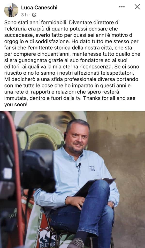 Sempre questa mattina Luca Caneschi con un messaggio sulla sua pagina Facebook saluta i suoi telespettatori con questo messaggio: