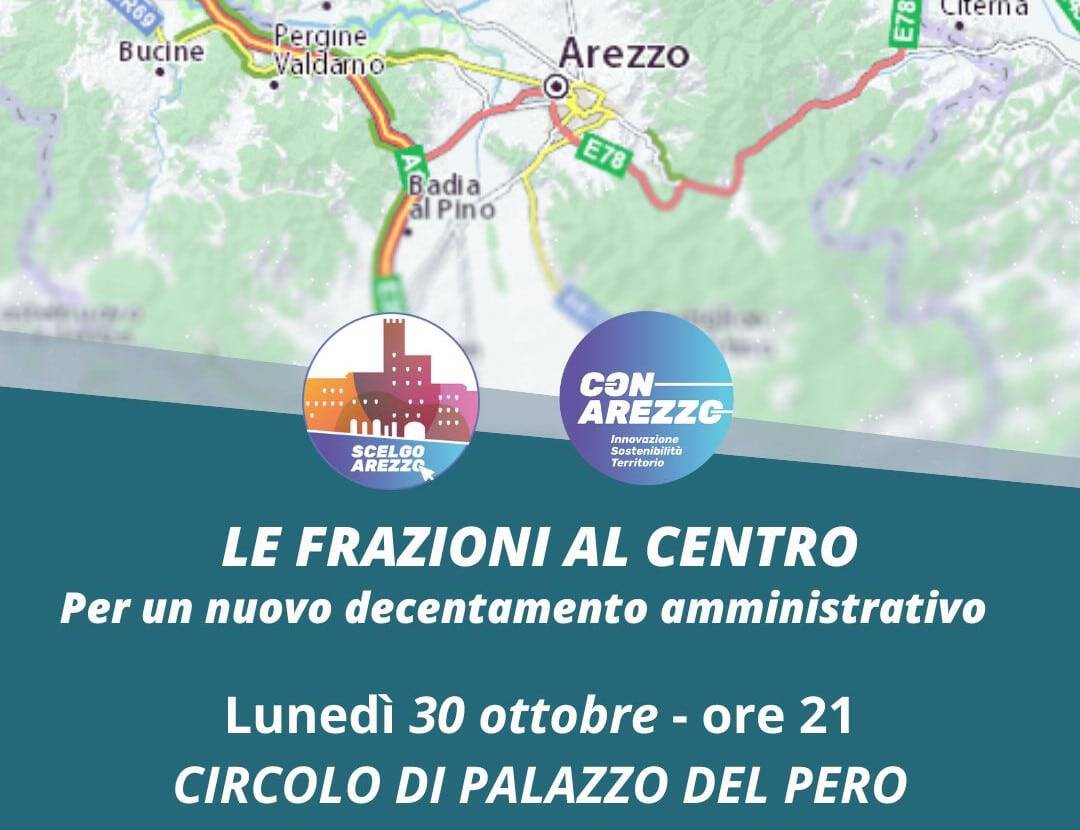 Lunedì 30 ottobre alle 21 al circolo di Palazzo del Pero si terrà la prima assemblea pubblica organizzata dal gruppo consiliare Scelgo Arezzo avente per tema “Le frazioni al centro”. Parteciperanno i due consiglieri comunali eletti nella lista: Marco Donati e Valentina Sileno.