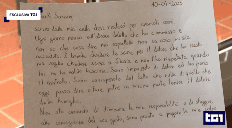 Alla fine l’ha scritta. Mark Samson, in carcere a Regina Coeli con l’accusa di aver ucciso Ilaria Sula, ha inviato una lettera di scuse alla famiglia. È un servizio esclusivo del Tg1 a rendere nota la missiva scritta “dalla mia cella dove rimarrò svariati anni”. Iniziano così le scuse del ragazzo: “Ogni giorno penso all’atroce delitto che ho commesso e non so cosa dire e soprattutto non so cosa mi sia accaduto“.