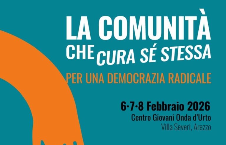 Il Movimento Municipalista BULE’ di Arezzo organizza il 6,7,8 febbraio 2026 presso il Centro Giovani Onda d’Urto di Villa Severi, l’incontro “La comunità che cura sé stessa”. Per una democrazia radicale.”