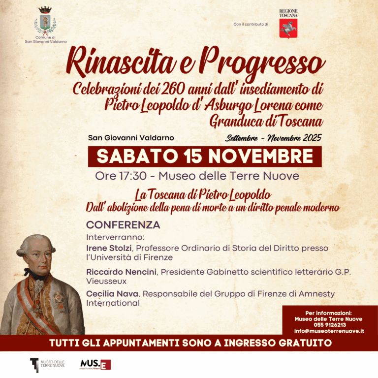L’iniziativa si inserisce nel percorso di celebrazioni dedicate ai 260 anni dall’insediamento di Pietro Leopoldo d’Asburgo Lorena come Granduca di Toscana, promosso dal Comune di San Giovanni Valdarno, in collaborazione con il Museo delle Terre Nuove e Fondazione MUS.E, con il contributo della Regione Toscana.
